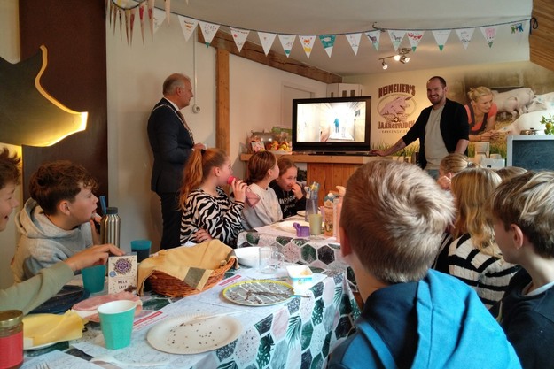 Naast het eten op de scholen was er dit jaar ook een lunch op de boerderij van Nieske en Jeroen Neimeijer. Daar was ook burgermeester Zuidema op bezoek om samen met de leerlingen van groep 8 van het Sterrenrijk, te genieten van de lunch. De komende weken zullen nog een aantal groepen de biologische boerderijen bezoeken om te kijken waar het voedsel vandaan komt. Ook gaan de boeren naar de scholen om het verhaal te vertellen over het belang van biologische voedselproductie.