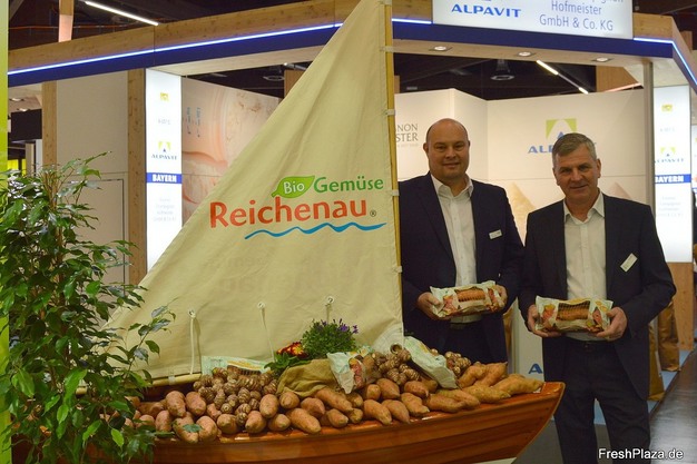 Ingo Bernhard en Christian Müller vertegenwoordigden Reichenau-Gemüse dit jaar op de BioFach in Neurenberg, waarbij ze de biologische zoete aardappelen onder de aandacht brachten.