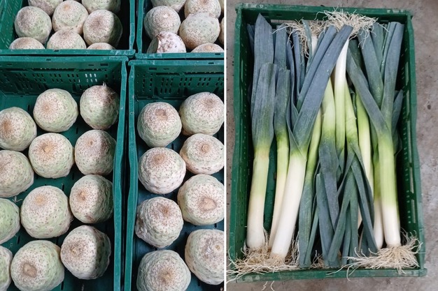 Bijna alle groenten zijn inmiddels binnen voor de biologisch teler uit Hooglede (België), waar momenteel prei, bloemkool, knolselderij, venkel en pompoen de klok slaan. "De bloemkolen zijn vorige week afgeoogst en ook de pompoenen zijn allemaal binnen en liggen in bewaring. Een deel van de knolselder is ook al binnen. Alleen zijn daar nog kisten bijgekocht die nog geleverd moeten worden. Zodra die er zijn, kunnen we verder oogsten. De laatste venkel wordt nu geoogst; binnen staat nog een klein beetje, maar dat zal eind volgende week ook afgerond zijn. Dan zitten we qua bloemkool, venkel, knolselderij en pompoen eigenlijk goed voor de winter."