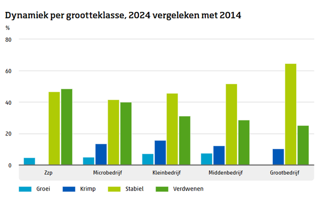 Vooral binnen het kleinbedrijf (10 tot 50 werkzame personen) was de neerwaartse beweging het sterkst. Van alle 39.539 kleine bedrijven uit 2014 was in 2024 ruim 16% gekrompen naar een lagere grootteklasse, terwijl slechts 7% doorgroeide. Het grootste deel bleef stabiel.