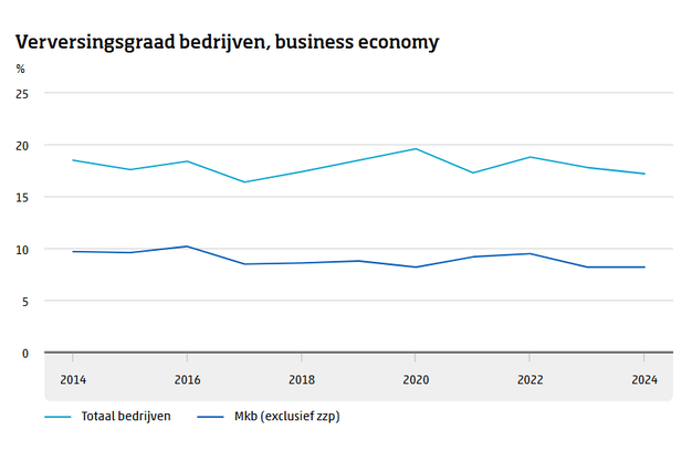 Binnen het mkb exclusief zzp'ers bleef de verversingsgraad gelijk op 8,2%. De meeste beweging zit dus bij de zelfstandigen zonder personeel. Een lage verversingsgraad kan volgens het CBS wijzen op stabiliteit, maar ook op minder vernieuwing. Een hoge waarde kan duiden op innovatie, maar even goed op onzekerheid.