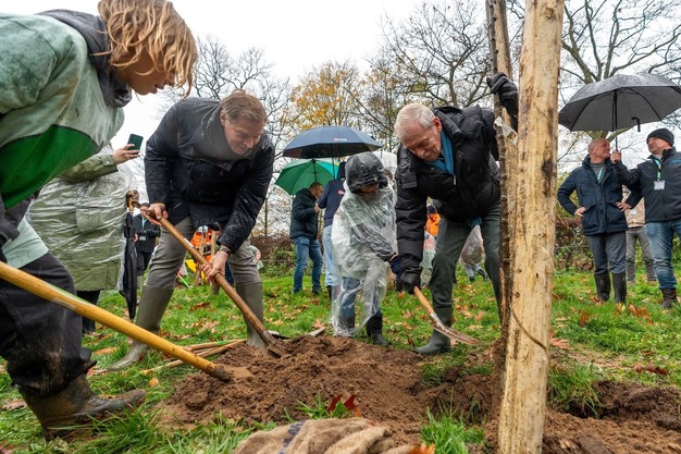 Demissionair staatssecretaris Jean Rummenie, gedeputeerde van de provincie Gelderland Harold Zoet, wethouder van de gemeente Lochem Lex de Goede, boer Johannes en boerin Joanne plantten samen met basisschoolkinderen fruitbomen die uit de unieke Achterhoekse appel- en perenrassen collectie van wetenschapper Hennie Rossel komen.