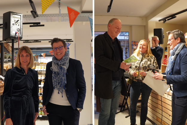 © OdinLinks: Barbara Alberding, de bedrijfsleider van de nieuwe winkel, samen met Merle Koomans van den Dries, algemeen directeur van Odin. Rechts: Oud-eigenaar Edwin Rutte krijgt een Odin-lidmaatschap cadeau van Merle Koomans van den Dries.