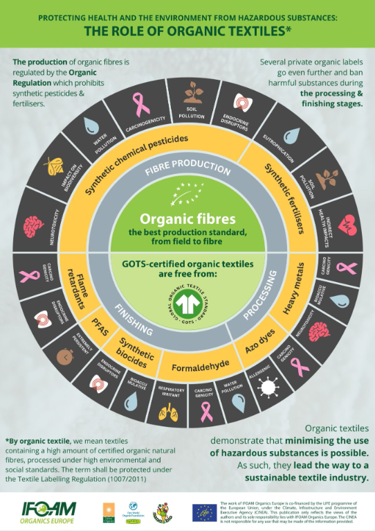 Bij de productie, verwerking en afwerking van textiel komen vaak stoffen voor die schadelijk zijn voor de menselijke gezondheid en het milieu. Zo gebruikt de conventionele katoenteelt 16% van de insecticiden wereldwijd, terwijl het verven en afwerken van textiel bijdraagt aan naar schatting 20% van de wereldwijde industriële watervervuiling