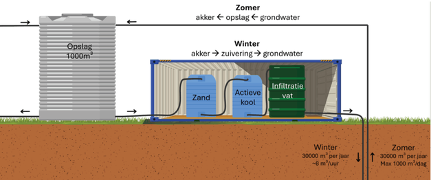 Schets van het circulaire watersysteem met bovengrondse buffer-opslag en het zuivering- en infiltratiesysteem op Hoeve Lotmeer.