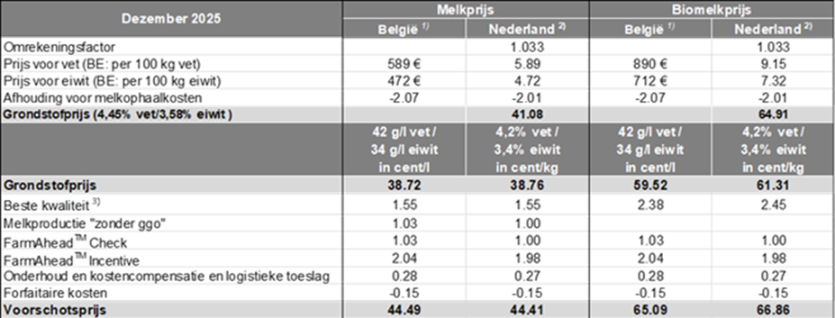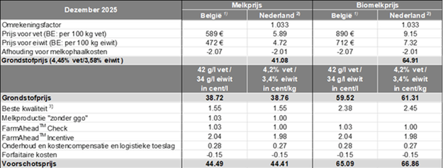 De Arla-melkprijs voor conventionele melk daalt vanaf december 2025 met 4,0 €ct/kg. De voorschotsprijs voor conventionele melk bedraagt 44,52 €ct/kg. De melkprijs voor biologische melk blijft ongewijzigd. De voorschotsprijs bedraagt 65,12 €ct/kg voor biologische melk.