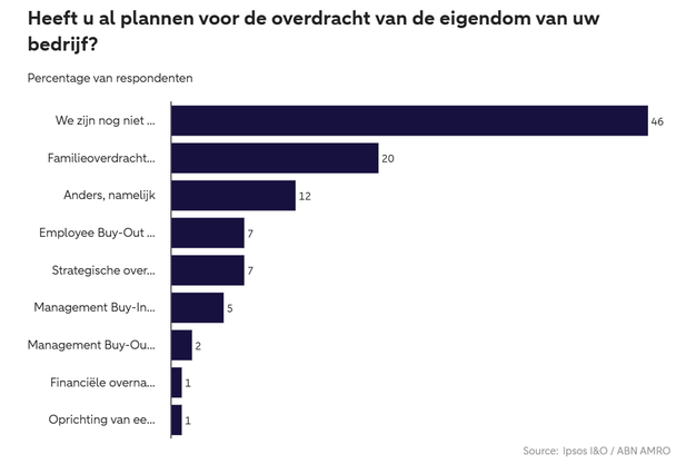 Uit onderzoek van Ipsos in opdracht van ABN AMRO blijkt dat 63% van de ondernemers hun bedrijf binnen tien jaar wil overdragen. Minder dan de helft (46%) heeft daarvoor al een opvolger of is actief op zoek. Leeftijd is voor 41% van de ondernemers een belangrijke reden om het bedrijf over te dragen, gevolgd door meer tijd voor andere interesses (32%).