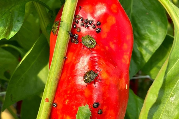 Eind juli kwam een nieuwe plaag nadrukkelijk op de voorgrond: de zuidelijke groene schildwants (Nezara viridula). Aanvankelijk sporadisch waargenomen, waren volwassen exemplaren en nimfen massaal aanwezig tegen september. Vruchten vertoonden zuigschade. Orius roofwantsen, sluipwespen en lieveheersbeestjes bleven actief, maar konden deze plaag niet onder controle houden. De zuidelijke groene stinkwants begint zich vanuit het warme zuiden al structureel in onze gematigde streken te vestigen, zeker in verwarmde serres, maar hij is ook al vaak te zien in tunnels en zelfs op aubergine en paprika in openlucht. Deze wants laat zich moeilijk beheersen. Handmatig wegvangen blijft voorlopig de meest effectieve aanpak in tunnels.