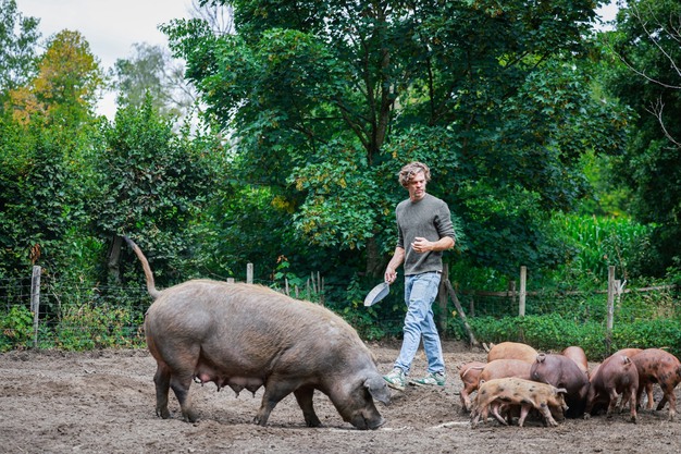 Het vee wordt bewust beperkt in aantal volgens het 'feed no food'-principe. Sophie vult aan: "We telen vooral grove groenten zoals aardappelen, pompoenen en uien. Tussen de granen en groenten planten we hazelaars, hoogstamfruit en kleinfruit, en we bewerken de grond minimaal met machines."