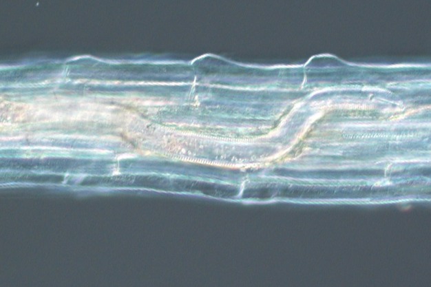 Microscopisch beeld van de nematode Meloidogyne incognita in een plantenwortel
