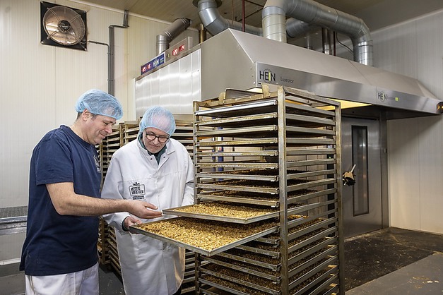 Bij binnenkomst vallen de geur van granen en het ritme van de machines op. Granen worden gezeefd, geweekt, geplet en gemengd met zaden, noten en gedroogd fruit. De granola's krijgen hun krokante laagje in de oven en het verpakkingsproces wordt deels ondersteund door een robot. "Op de inpakafdeling hebben we robotisering ingezet. Niet om mensen te vervangen, maar om de groei op te vangen", aldus Van den Berg.