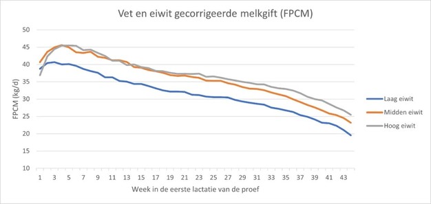 Figuur 2: Vet- en eiwitgecorrigeerde melkgift (FPCM) van koeien met verschillende eiwitgehaltes in het rantsoen (Laag: 13,3%; Midden: 14,3%; Hoog: 15,4%) tijdens de eerste lactatie (44 weken) van de proef.