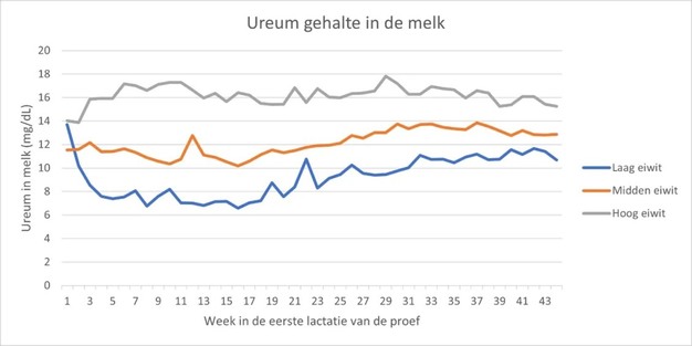 Tussen de midden- en hoog-eiwitgroep waren geen significante verschillen in opname of productie, al lag de melkproductie bij de hoog-eiwitgroep gemiddeld iets hoger. De ureumconcentratie in melk (Figuur 3) bleek duidelijk samen te hangen met het eiwitniveau in het voer: hoe lager het eiwitgehalte, hoe lager het melkureum.