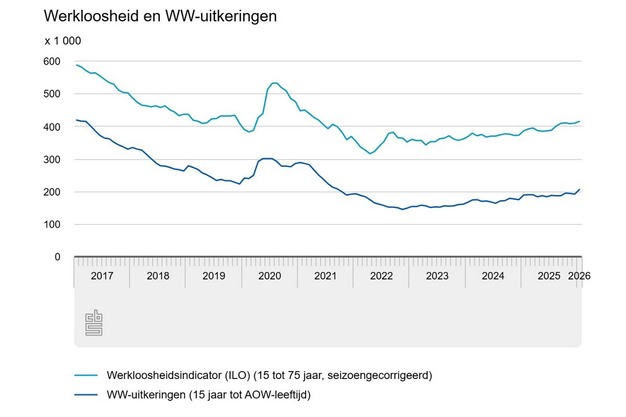 In januari 2026 waren er 415 duizend werklozen. Het aantal werklozen nam over de afgelopen drie maanden toe met 1 duizend gemiddeld per maand. Hiermee was 4,0 procent van de beroepsbevolking van 15 tot 75 jaar werkloos, net als in de vier maanden daarvoor. Het aantal mensen met betaald werk nam de afgelopen drie maanden af met gemiddeld 4 duizend per maand. Dit meldt het Centraal Bureau voor de Statistiek (CBS) op basis van nieuwe cijfers. UWV registreerde eind januari 206 duizend lopende WW-uitkeringen.