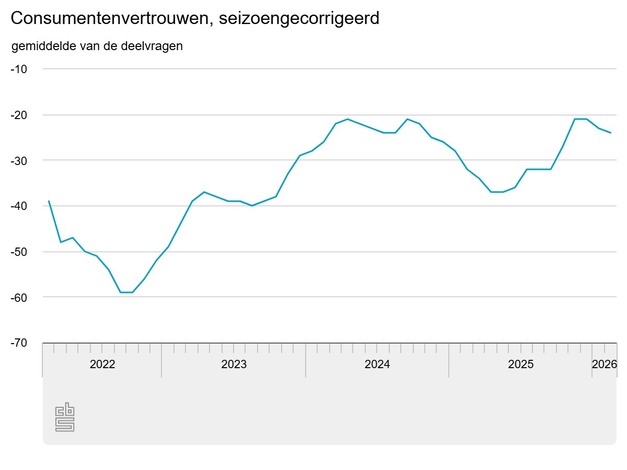 Ondertussen is het vertrouwen van consumenten in februari iets verder verslechterd, meldt het Centraal Bureau voor de Statistiek (CBS). Het consumentenvertrouwen gaat van -23 in januari naar -24 in februari. Het oordeel over het economisch klimaat verslechtert, de koopbereidheid verbetert iets.