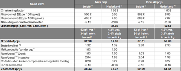 De genoemde voorschotsprijzen gelden voor melkleveringen met 4,45 procent vet en 3,58 procent eiwit. In de prijzen zijn toeslagen inbegrepen voor kwaliteit, logistiek, de Klimaatcheck, de duurzaamheidstoeslag van Arla Foods en ggo-vrije melkproductie. De prijzen zijn exclusief de verwachte nabetaling (inclusief rente) en de consolidering.