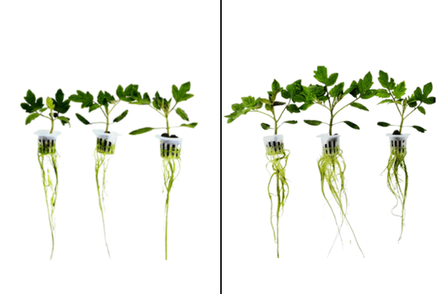 Onbehandelde tuinkersplanten onder hoge lichtintensiteit met minder bladeren, kleiner bladoppervlak en dunnere worteldichtheid (links) en behandelde tuinkersplanten onder dezelfde stress met meer bladeren, groter bladoppervlak en dichtere wortelgroei (rechts)