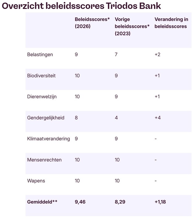 Triodos Bank heeft het krediet- en beleggingsbeleid verduidelijkt en aangescherpt, onder meer met expliciete eisen voor diervriendelijke landbouw en voor gelijkheid, diversiteit en inclusie bij grote bedrijven. Scores voor belastingen, biodiversiteit, dierenwelzijn en gendergelijkheid zijn daardoor verbeterd.