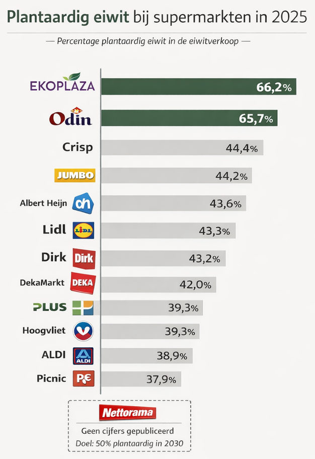 Hoewel Ekoplaza en Odin koplopers zijn, laat de Eiweet-meting op sectorniveau zien dat de landelijke verkoop van plantaardige eiwitten in supermarkten in 2025 licht daalde tot 42,6%, tegenover 42,7% in 2024. Het tussendoel van 50% plantaardige eiwitten voor 2025 werd door de sector als geheel niet gehaald.