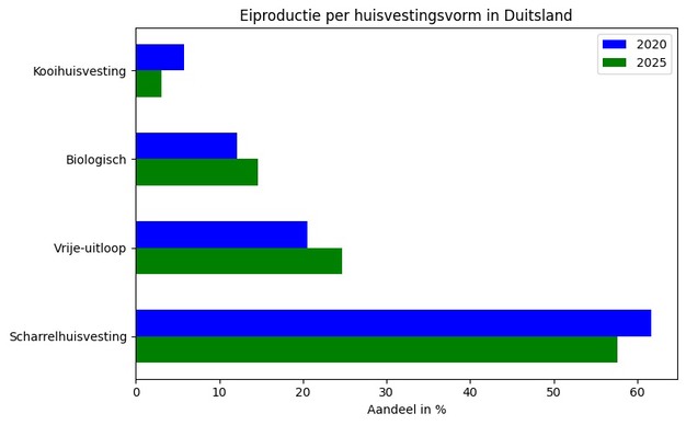 De cijfers laten zien dat zowel biologische als vrije-uitloopproductie een groter aandeel krijgen in de Duitse markt, terwijl traditionele scharrel- en kooisystemen afnemen.