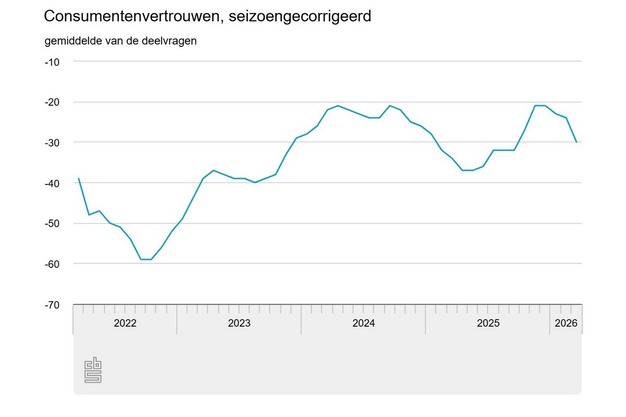 Het vertrouwen van consumenten verslechtert in maart verder, meldt het Centraal Bureau voor de Statistiek (CBS). Het consumentenvertrouwen gaat van -24 in februari naar -30 in maart. Dat is de grootste daling in bijna vier jaar. Vooral het oordeel over het economisch klimaat verslechtert.