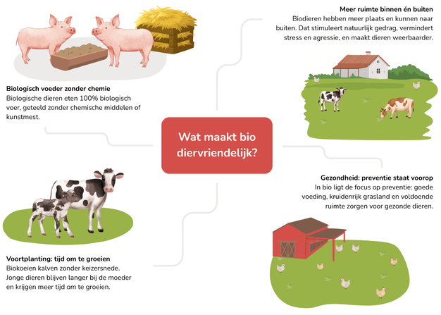 Biologische landbouw legt volgens Vlaams Centrum voor Agro- en Visserijmarketing (VLAM) de nadruk op dierenwelzijn. Runderen, varkens, geiten en kippen krijgen meer ruimte, biologisch voeder en de kans om natuurlijk gedrag te vertonen.