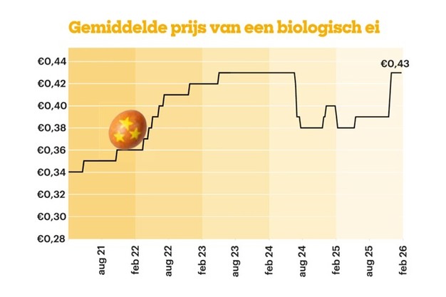 De prijs van eieren is in vijf jaar tijd sterk gestegen, blijkt uit onderzoek van de Consumentenbond. In februari 2026 kostte een gemiddeld ei 39 cent, een stijging van 38 procent ten opzichte van 2021. Vrije-uitloopeieren werden het hardst duurder (48%), scharreleieren stegen 40%, terwijl biologische eieren relatief minder in prijs toenamen (26%) en gemiddeld 43 cent per stuk kostten.