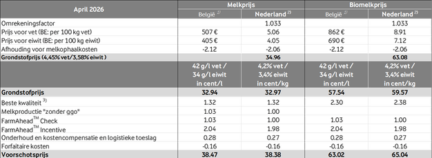 De biologische melkprijs is gebaseerd op melkleveringen met 4,45 procent vet en 3,58 procent eiwit. De prijs voor vet bedraagt 8,91 euro per kilogram en voor eiwit 7,12 euro per kilogram.