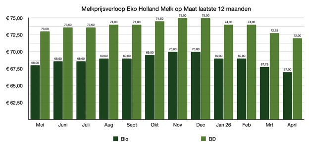 Eko Holland meldt voor zijn Melk op Maat-programma een prijs van 67 euro per 100 kilo voor biologische melk. Biologisch-dynamische melk wordt beloond met 72 euro per 100 kilo. Daarmee zet de lichte daling van maart door: toen lag de prijs voor biologische melk nog op 67,75 euro en voor biologisch-dynamische melk op 72,75 euro.