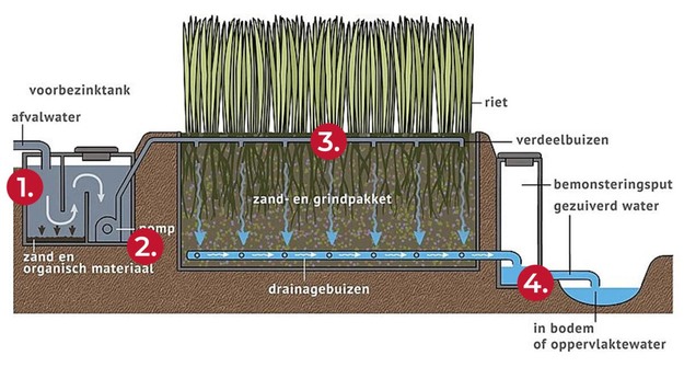 Een helofyt is een moerasplant die wortelt in de waterbodem, maar met stengel en bladeren boven water uitsteekt. Het filter maakt gebruik van deze planten om afvalwater op natuurlijke wijze te reinigen tot een milieuvriendelijk niveau. Het systeem op De Bonte Weide werkt in vier stappen: het water wordt eerst voorgezuiverd in een septische tank, vervolgens naar het filter gepompt, langs de wortels van de helofyten geleid, en tot slot door water- en oeverplanten in een afgesloten sloot verder gezuiverd. Daarna stroomt het water terug naar het polderwatersysteem.