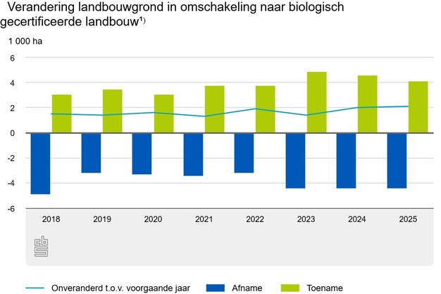 Per saldo nam het biologische areaal in 2025 met ruim 2,5 duizend hectare toe. Er kwam 7,8 duizend hectare bij, terwijl 5,3 duizend hectare uit de biologische productie verdween. Het merendeel van de percelen blijft langdurig biologisch: van de 84,3 duizend hectare in 2024 was 93,8 procent een jaar later nog steeds biologisch gecertificeerd.