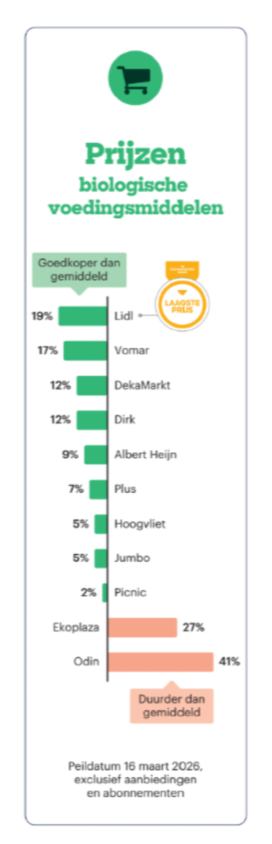De speciaalzaken Ekoplaza en Odin komen volgens de peiling als duurste naar voren, maar onderscheiden zich door een volledig biologisch assortiment. Bij reguliere supermarkten hebben Albert Heijn, Jumbo en Plus het grootste aanbod biologische producten. De prijsverschillen lopen uiteen per productgroep. Bij zuivel, soep, rijst en pasta zijn de verschillen relatief klein, terwijl biologische groente, fruit, chips, sauzen en thee vaak aanzienlijk duurder zijn. In sommige gevallen is de biologische variant goedkoper dan de reguliere versie, zoals volkorenmacaroni bij DekaMarkt.