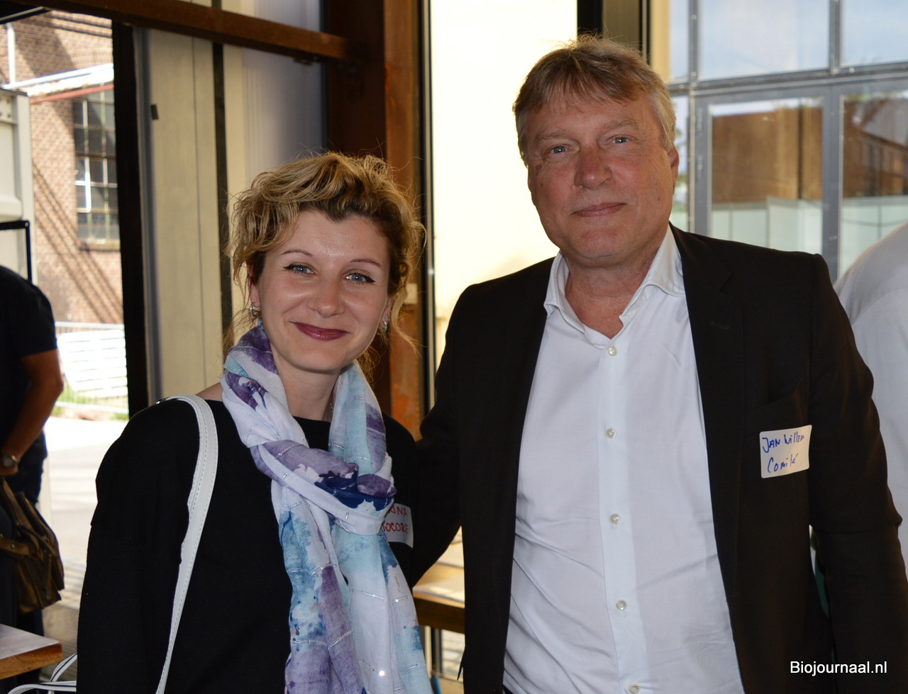 Marina van BioCore met één van de sprekers, Jan-Willem Baas, voorzitter van het Comité van Graanhandelaren. Marina is een paar maanden geleden vanwege de oorlog uit Oekraïne gevlucht.