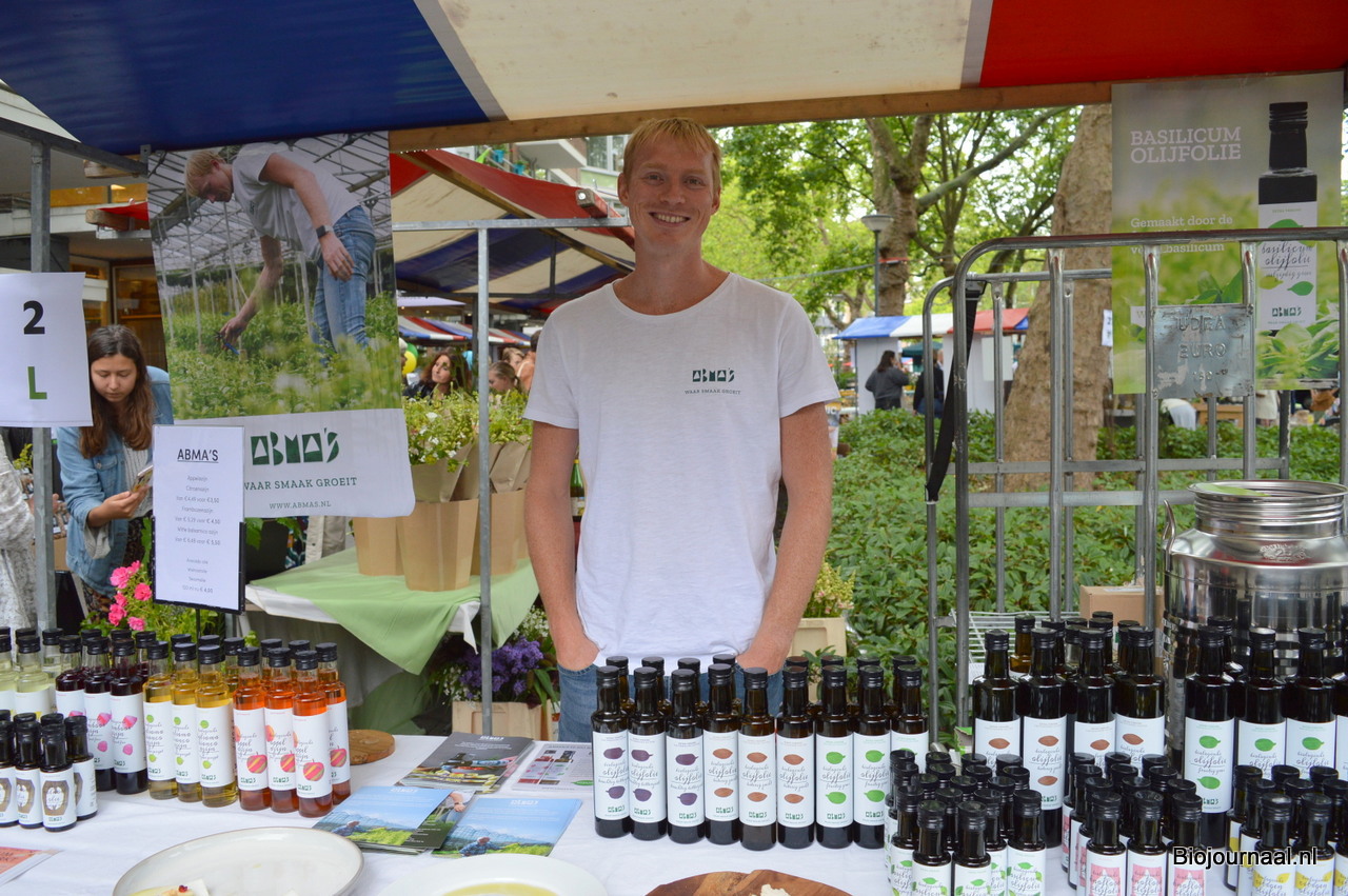 Cesar Abma met de verschillende varianten biologische olijfolie en azijn van Abma's. Vanaf nu is Abma's verkrijgbaar bij Gimsel. "Wat vandaag over is gaat de winkel in", vertelt hij.
