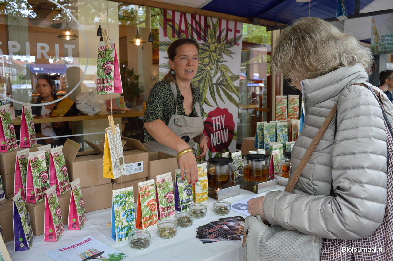 Martha Visser liet de bezoekers proeven van de biologische hennepthee van Dutch Harvest.