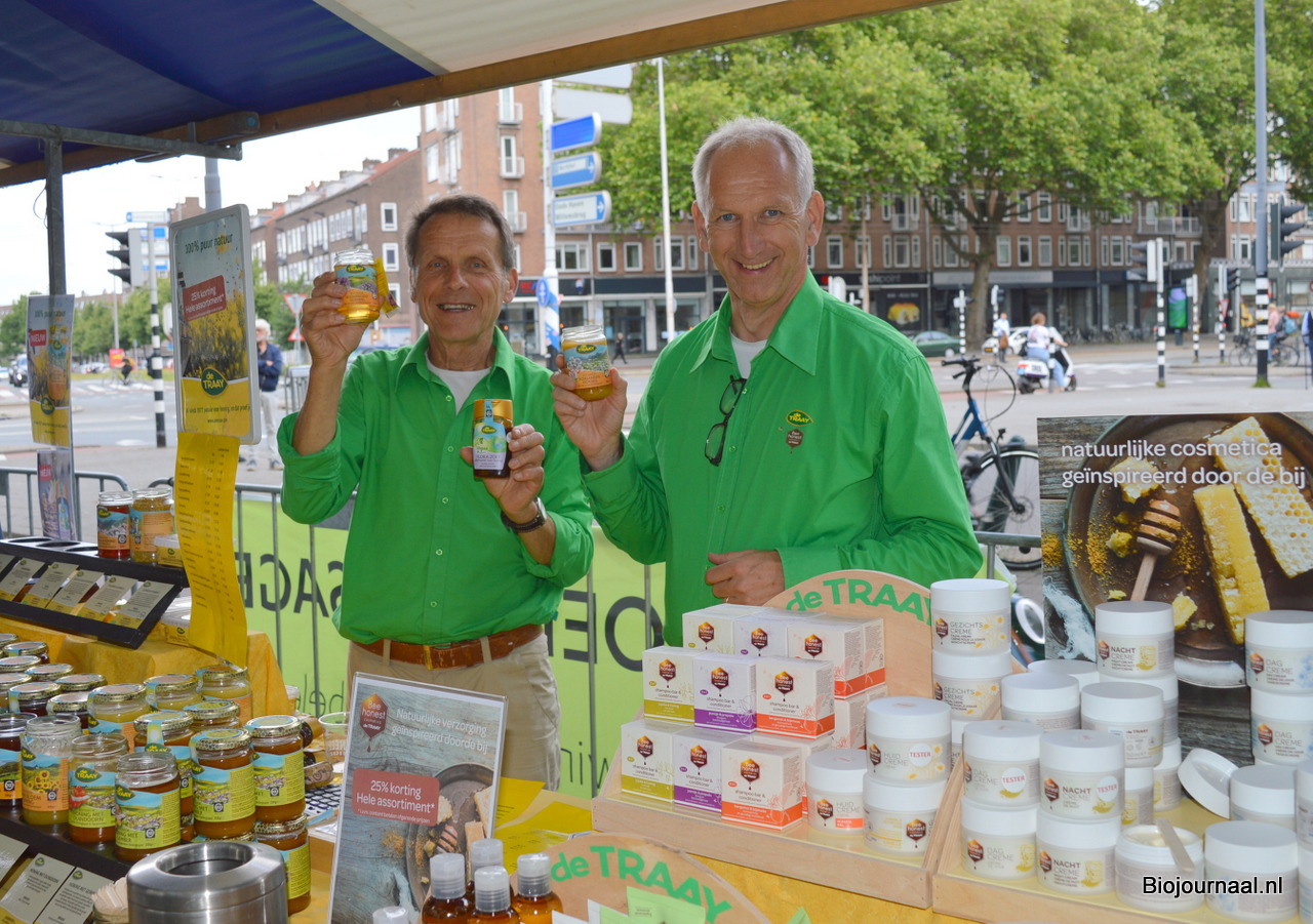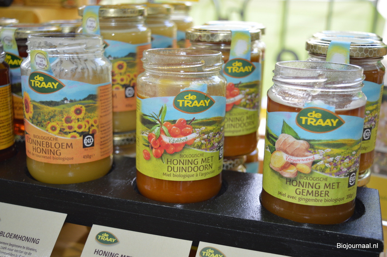 Wim Roeleveld en Eric van Gool tonen allebei de nieuwste producten van imkerij De Traay: Biologische Bijenbroodhoning, Flora Zoet (Vegan alternatief voor honing) en Biologische Korianderhoning.