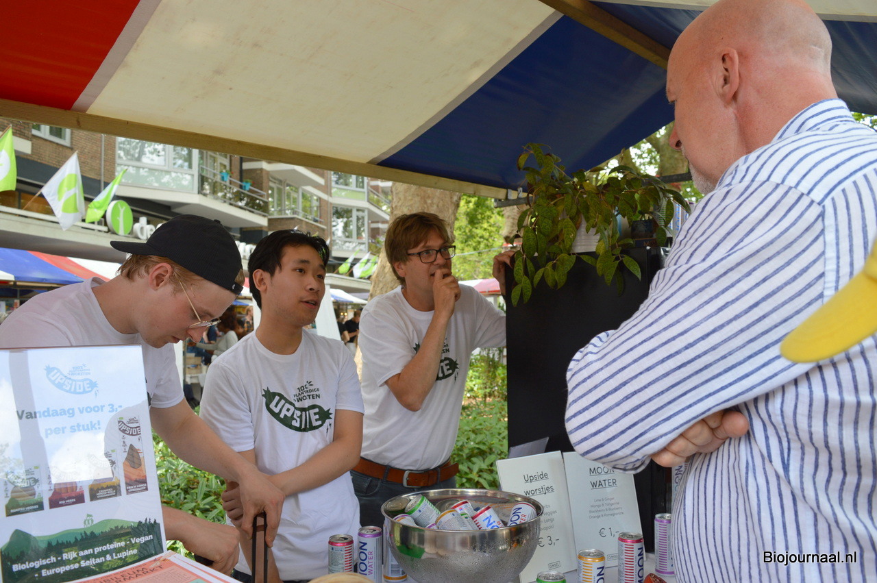 In het midden luistert Dirk Schnellen bij Brandplant naar de mening van één van de marktbezoekers over de zojuist geproefde vegen worstjes. "We gaan twee nieuwe Upside-worstjes ontwikkelen en willen hier graag de meningen over peilen."