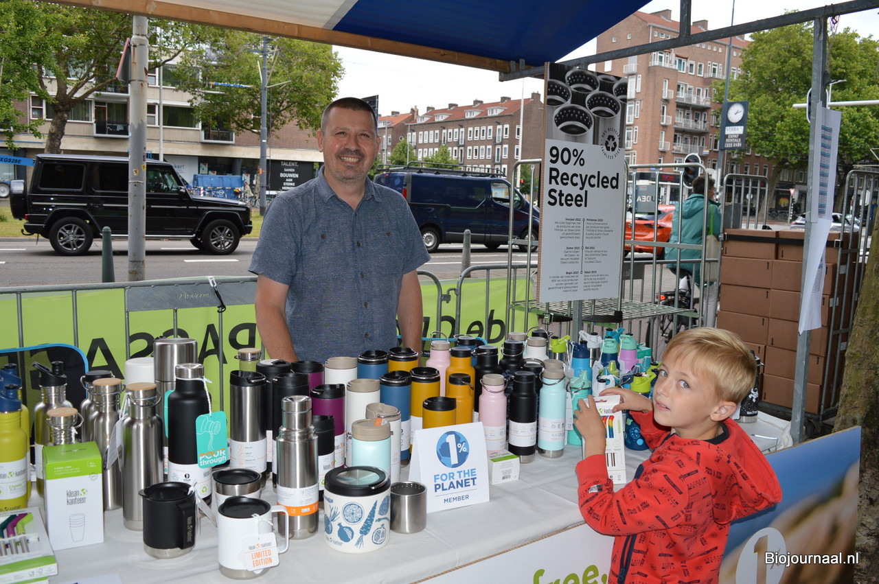 Patrick Hulleman van Klean Kanteen helpt Biojournaal-assistent Joah Pors bij de aankoop van wat duurzame rietjes.