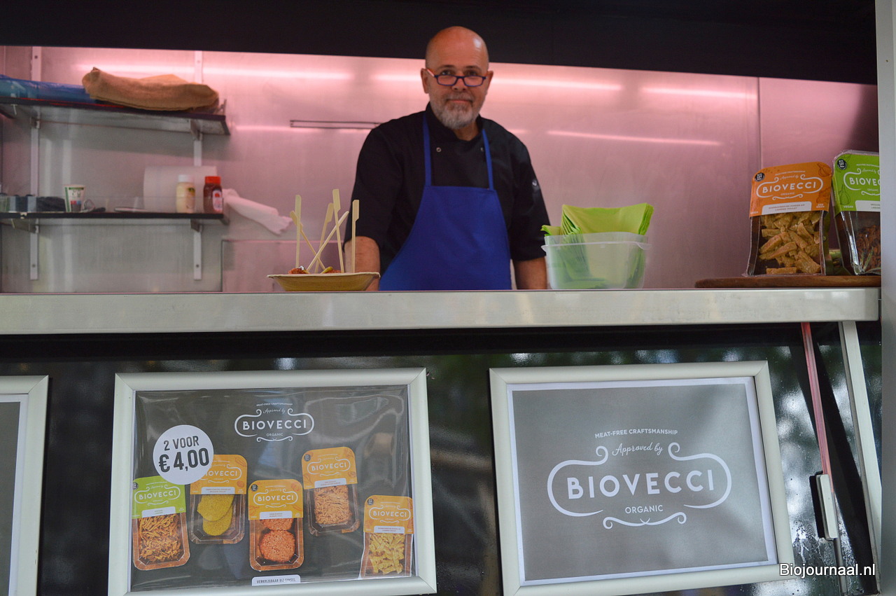 Andreas Lex liet bezoekers proeven van de biologische vleesvervangers van Biovecci.