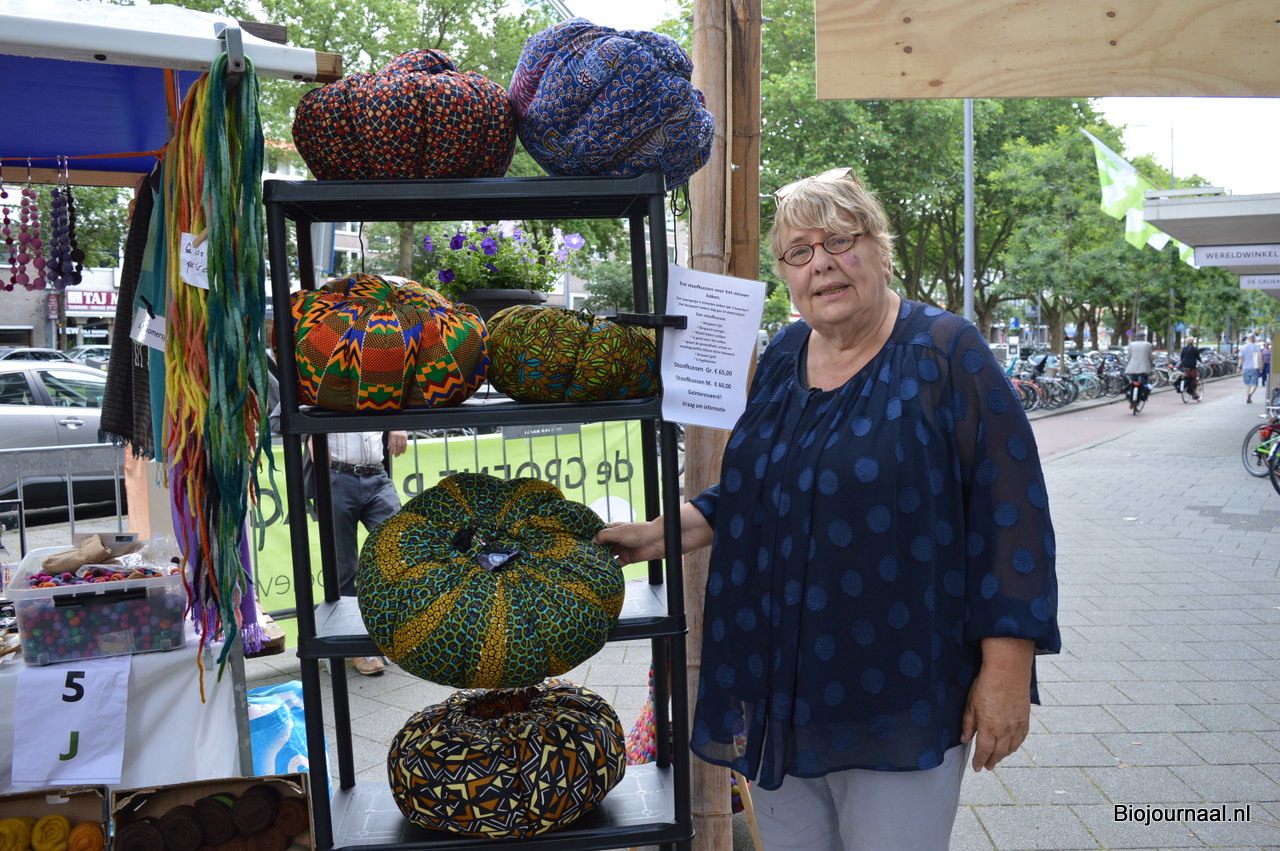 Marijke Visser met naast haar stoofkussens uit Ghana, die in de Wereldwinkel verkrijgbaar zijn.