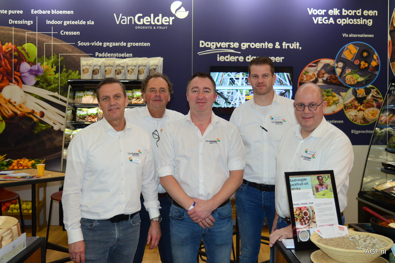 Anton van Gelder, Peter Stavasius, Hans van der Wegen, Remko van Koesveld en Corne Pijnenburg van Van Gelder Fruit. Op de beurs dit jaar veel aandacht naar Vega producten.