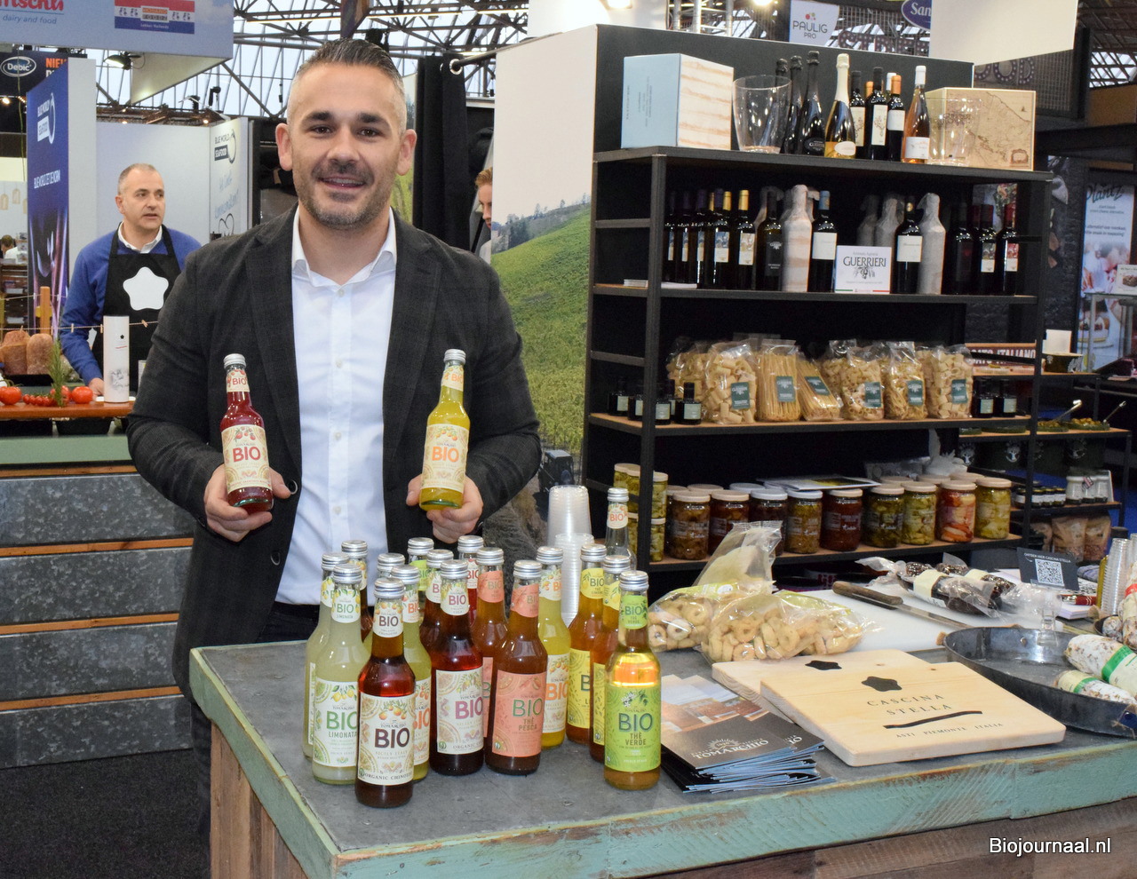 Carlo Moro van Mercato Italiano met Tomarchio frisse fruitdranken van lokaal fruit van Sicilië vlakbij de Edna en ook het bronwater komt uit de Edna.