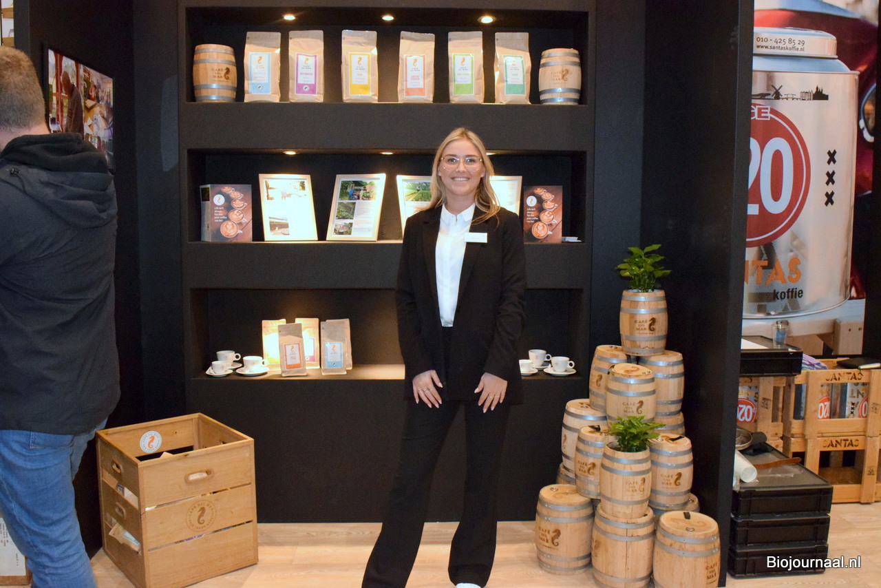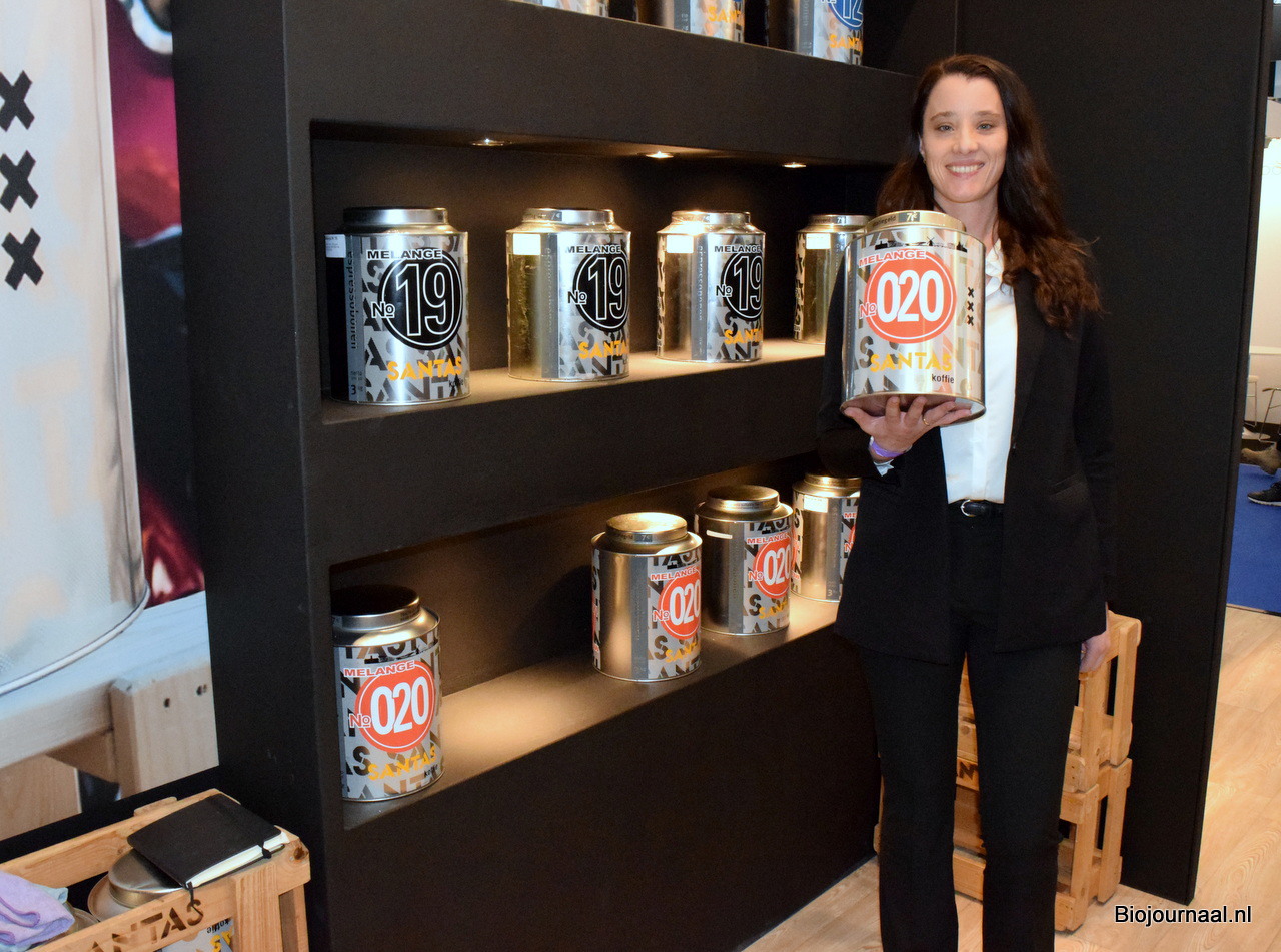 Erica Kapoen van Santas, zij verkopen koffie alleen in blikken, welke opnieuw gevuld kunnen worden.