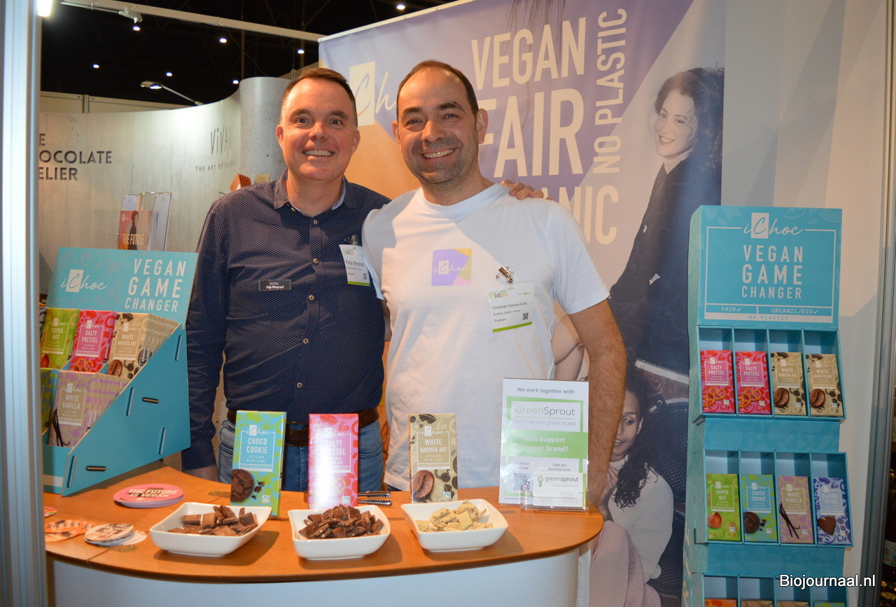 Feijo Blesgraaf en Christoph Kampschulte lieten bij EcoFinia proeven van de iChoc-repen en de nieuwe vegan Vivani repen: Almond Nougat Crisp en Creemy Classic.