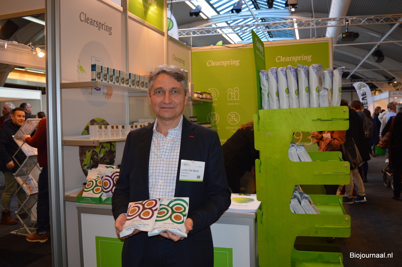 Lucio di Berti toont de nieuwe varianten bruine rijstcrackers van Clearspring: Zwarte peper & Tamari en Groene Nori & Tamari.