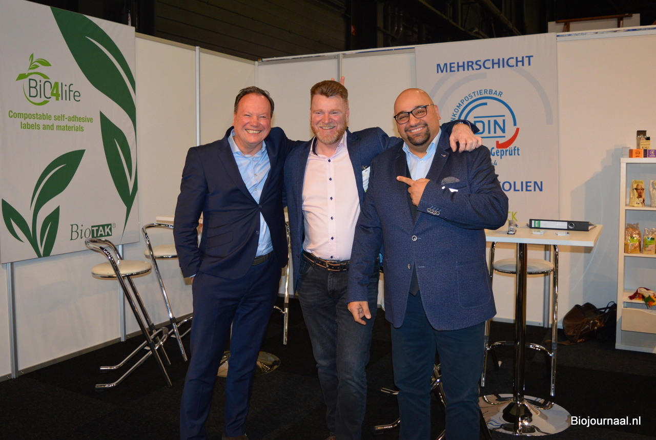 Bij Bio4Life en Bio4Pack: Marcel de Oude, Patrick Gerritsen en Yasar Türkoğlu. Patrick: "Onze 3 laagse folie, die herkenbaar is aan het composteerbaar logo met code 9P0044, voldoet aan de Europese norm voor thuis-composteren. Deze folie heeft de hoogst mogelijke barrière-eigenschappen waardoor de folie geschikt is voor het verpakken van alle denkbare droge producten."