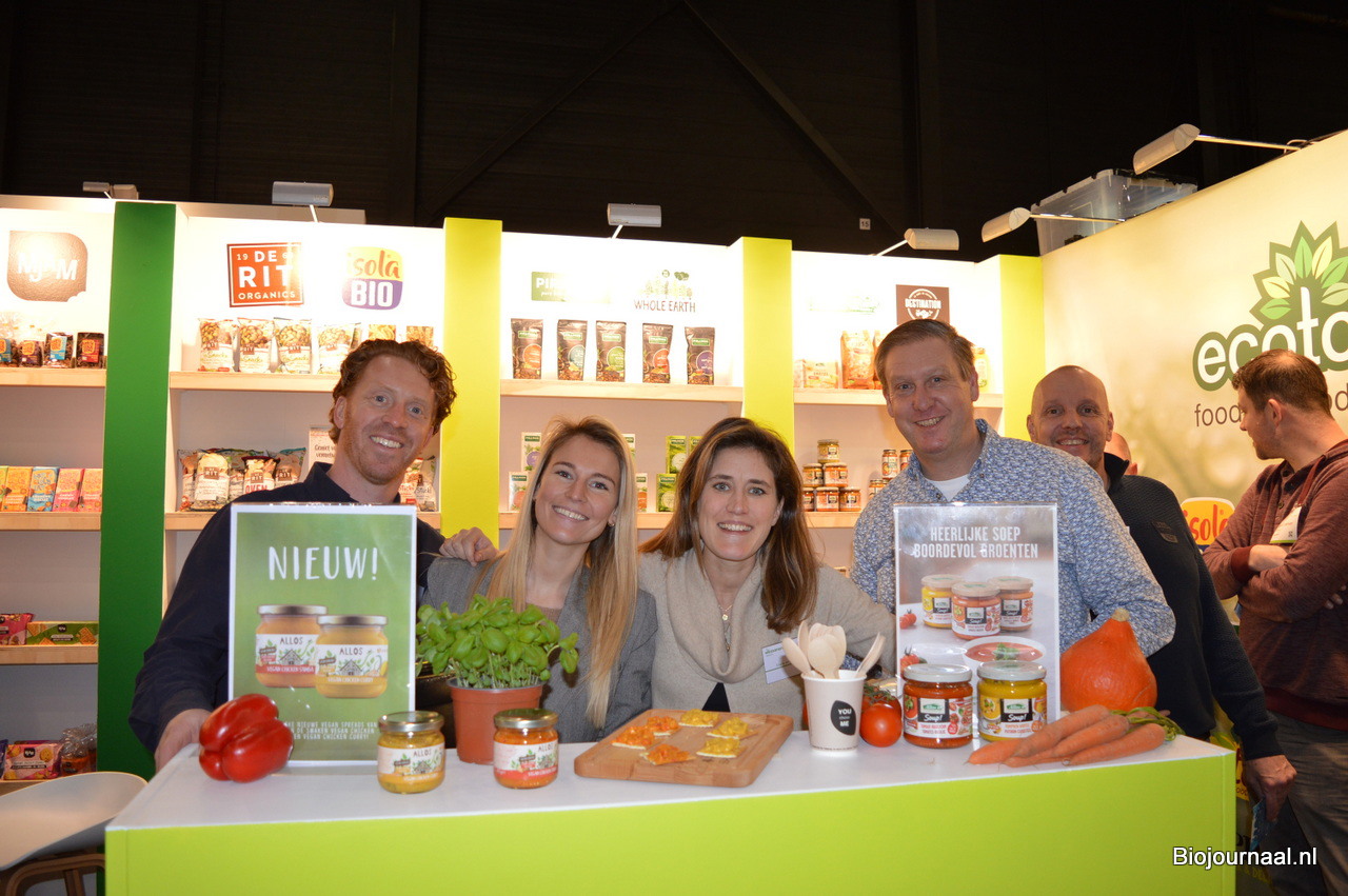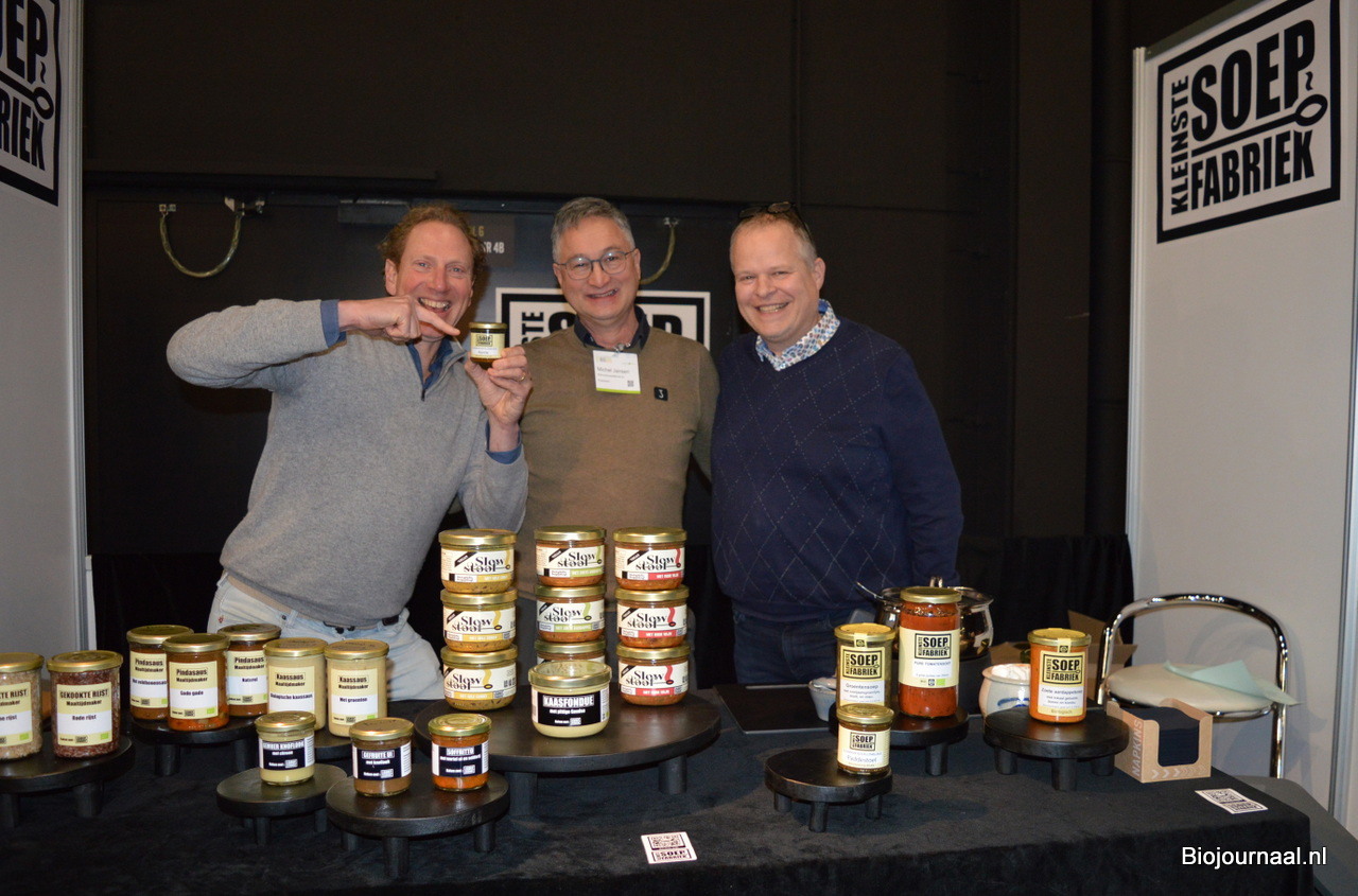Bij de KleinsteSoepfabriek stonden allerlei teasers, waaronder diverse 'maaltijdmakers' zoals gekookte rijst(soorten) in pot, biologische kaassaus (met en zonder groenten) en verschillende varianten pindasaus (o.a. naturel en Gado gado). Op de foto: Pascal Camps, Michel Jansen en Piet Wijffels.