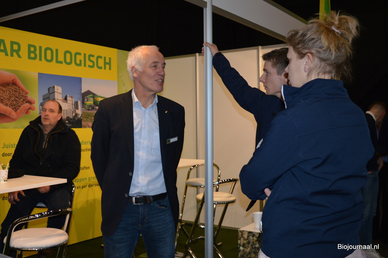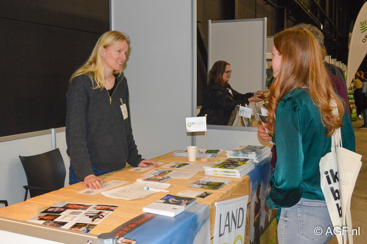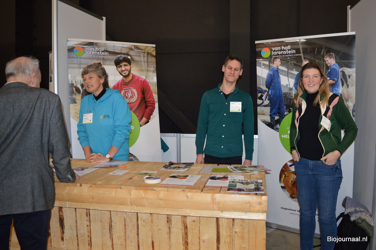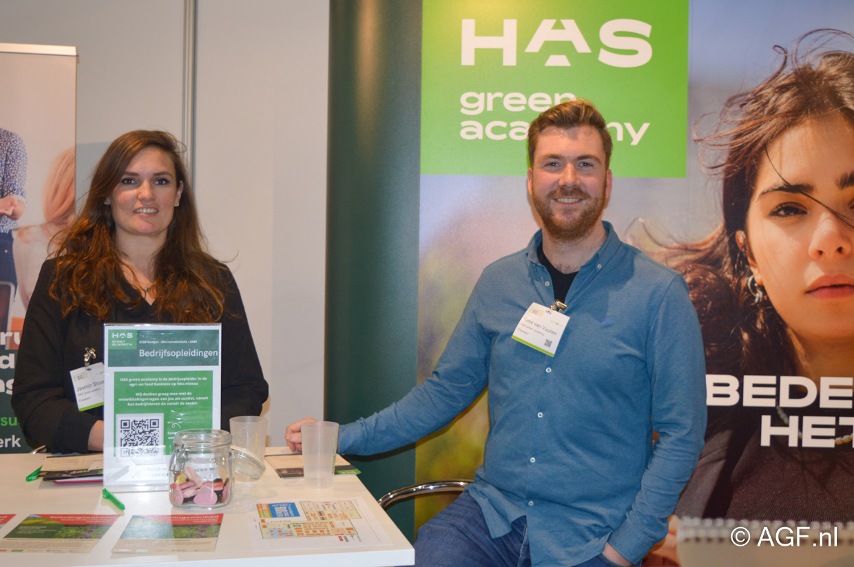 Hogeschool HAS heeft een breed assortiment scholingsaanbod op groen gebied en daarom goed geschikt voor toekomstige biologische telers. Op de foto Jasmijn Stroos en Kees van Vuren, zij vertegenwoordigden de school op de biobeurs.