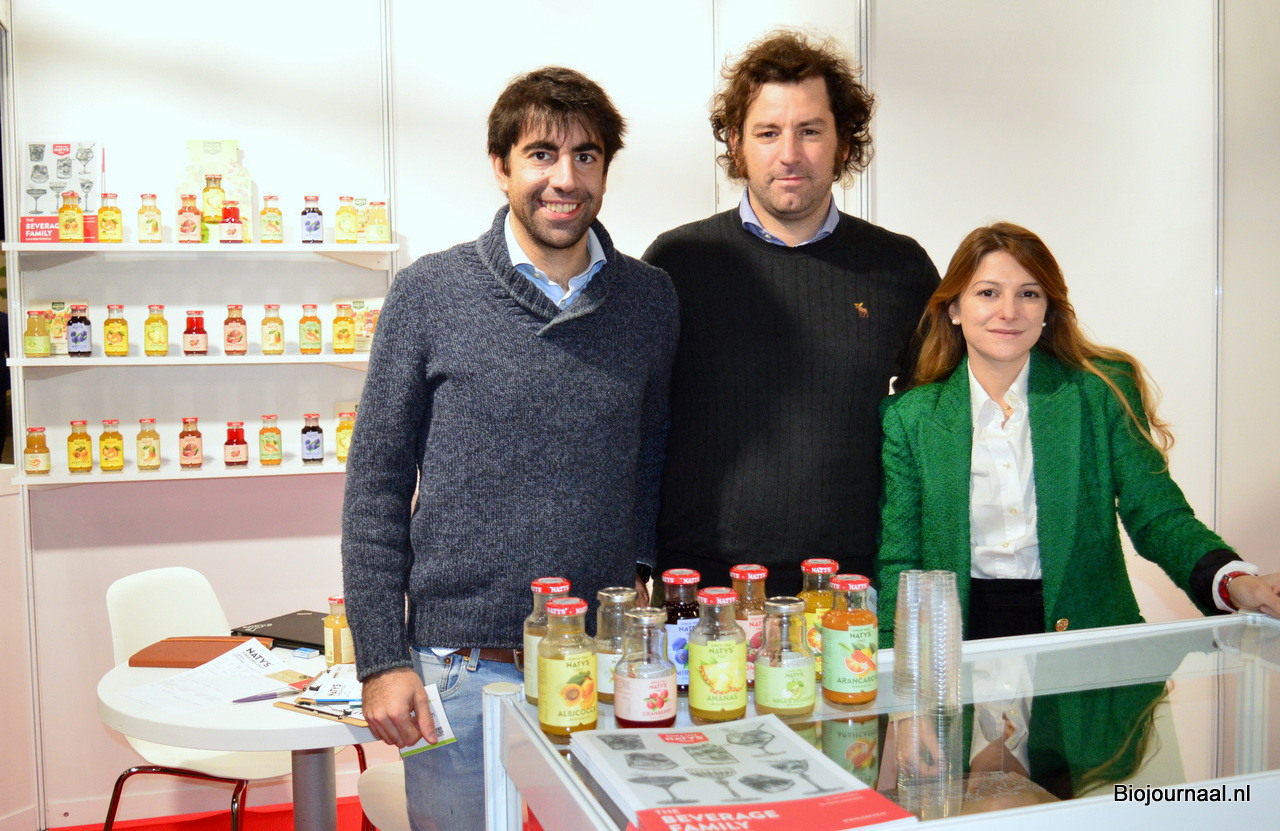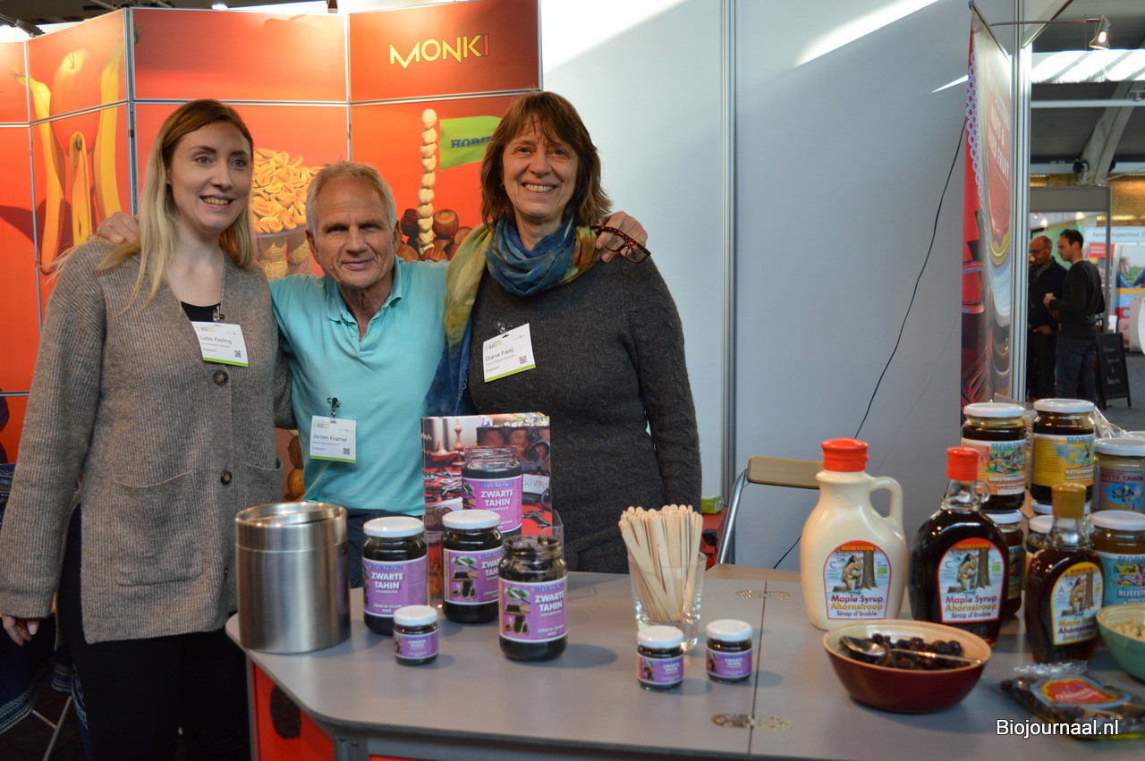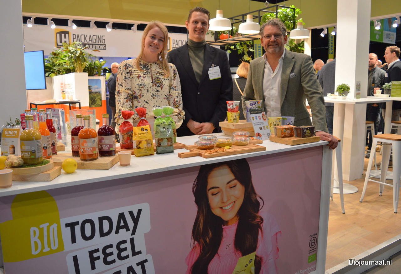 Bij De Smaakspecialist waren verschillende nieuwtjes te melden. "We worden exclusief distributeur van Happy Coco", vertelt Pieter Dirven (rechts op de foto). Links naast hem Lisa Bastiaansen en Menno Snijders. Ook nieuw zijn BioToday Ging'r Sparkling en het assortiment van Seamore is uitgebreid met kruidenmixen.