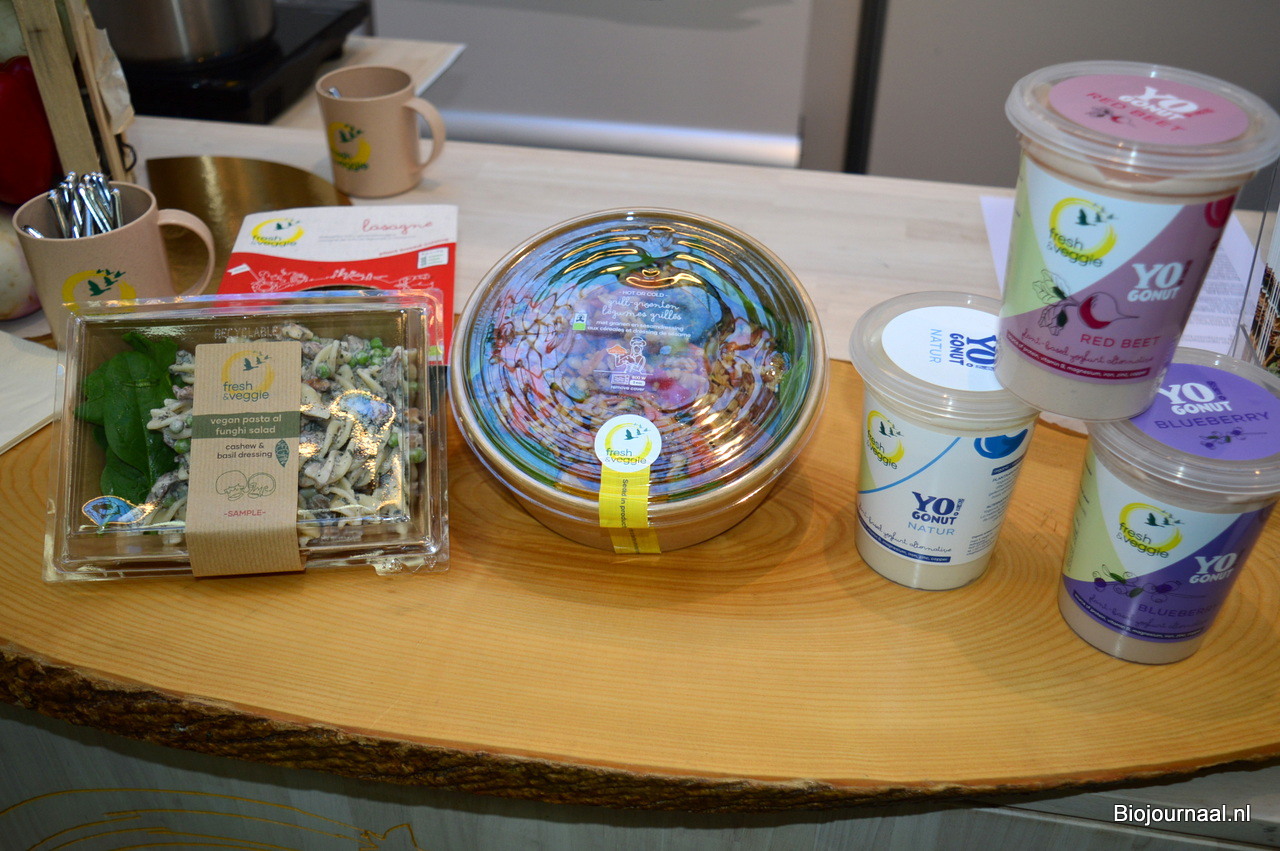 Bij Ecotone (Wessanen Benelux): Ann-Sophie Boehme en Eliane de Monchy. Binnenkort nieuw van Allos: Vegan Chicken Samba en Vegan Chicken Curry (links op de toonbank).